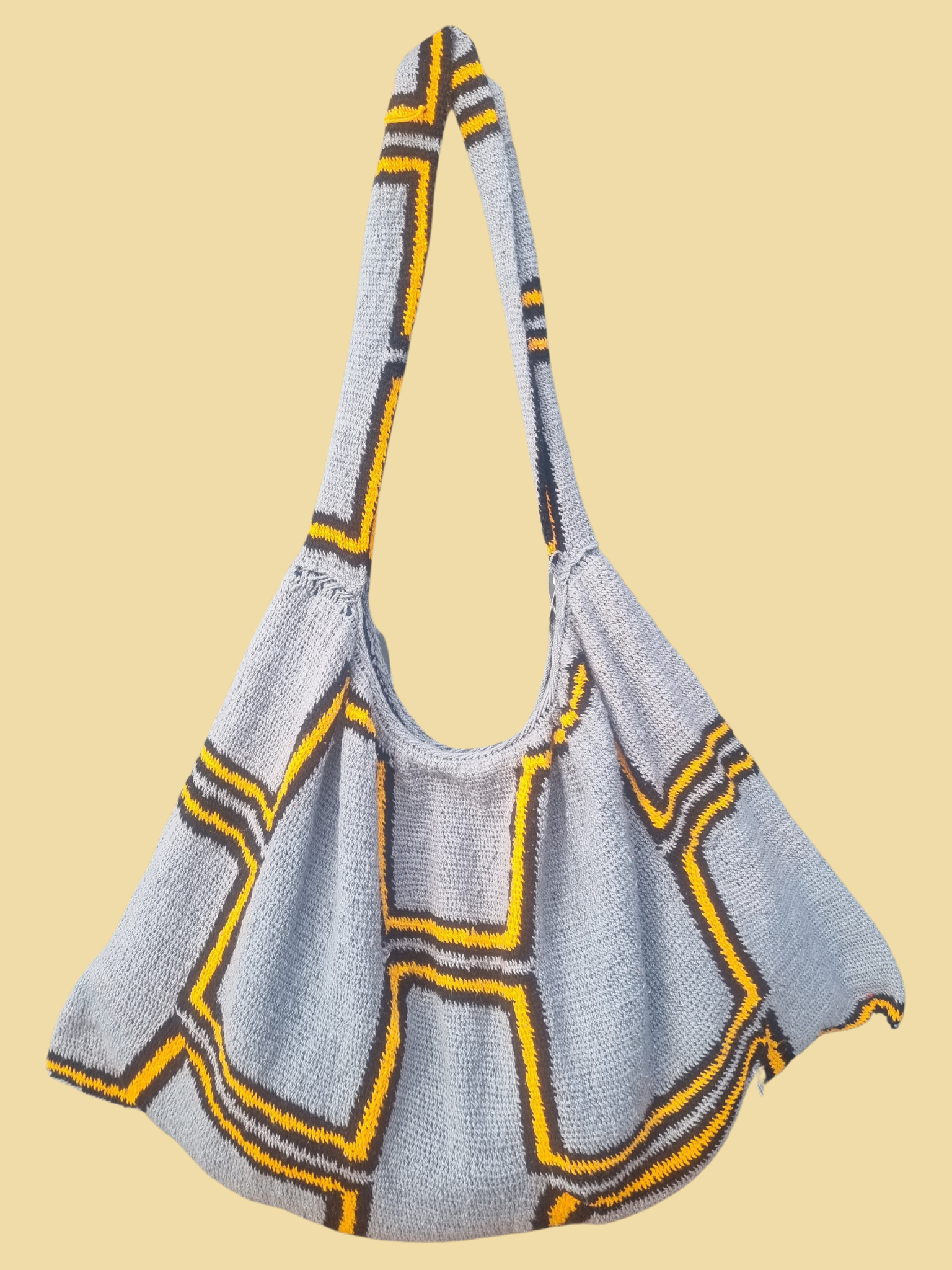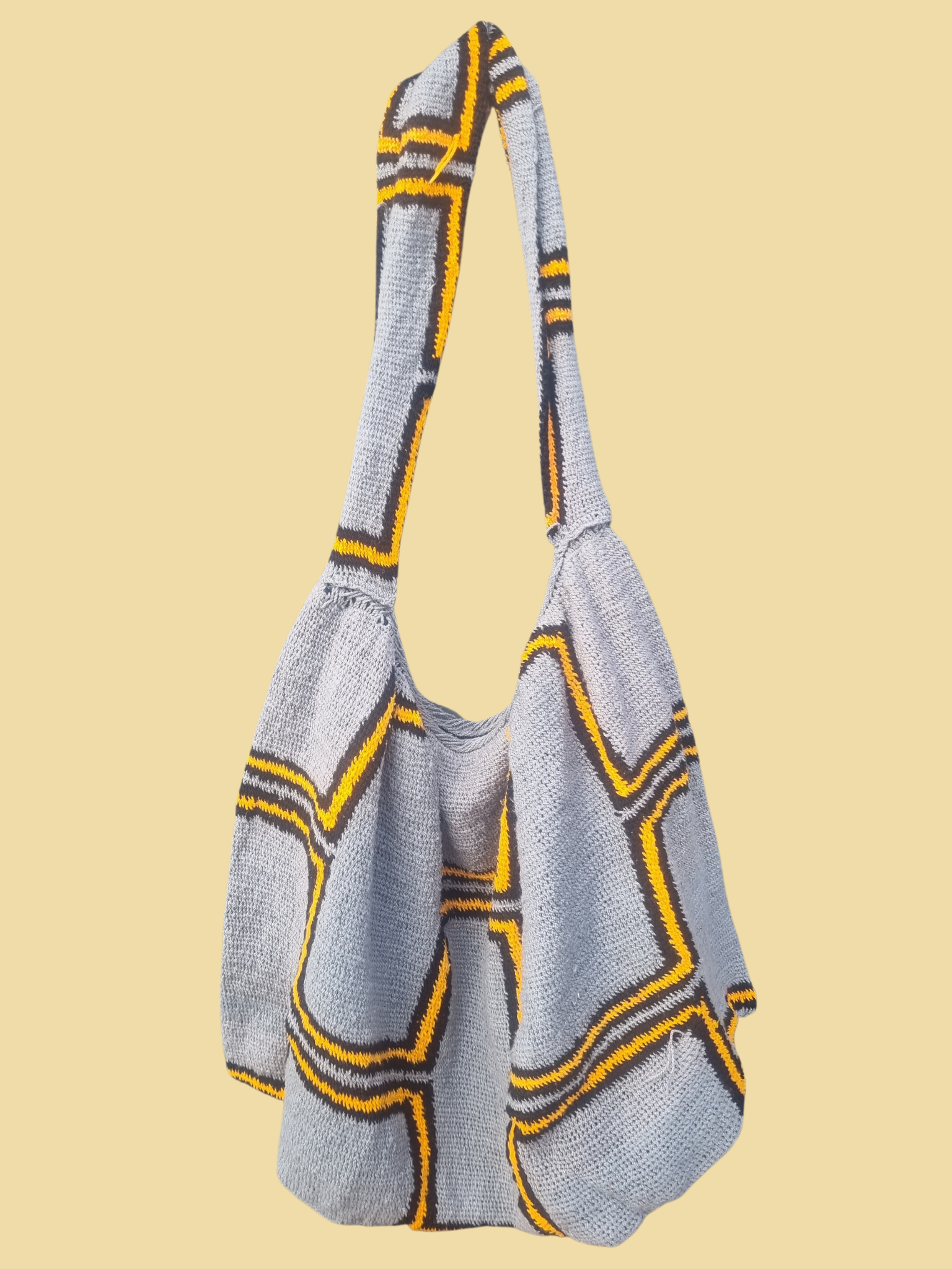 Keep your bilum vibrant by spot cleaning with mild soap and water, or gently hand washing in lukewarm water. If machine washing, use a mesh bag on a cold, delicate cycle, separate from rough fabrics. After washing, reshape and lay flat to dry. Never wring, twist, or hang. Store in a cool, dry place away from direct sunlight and sharp objects to protect its colour and weave.