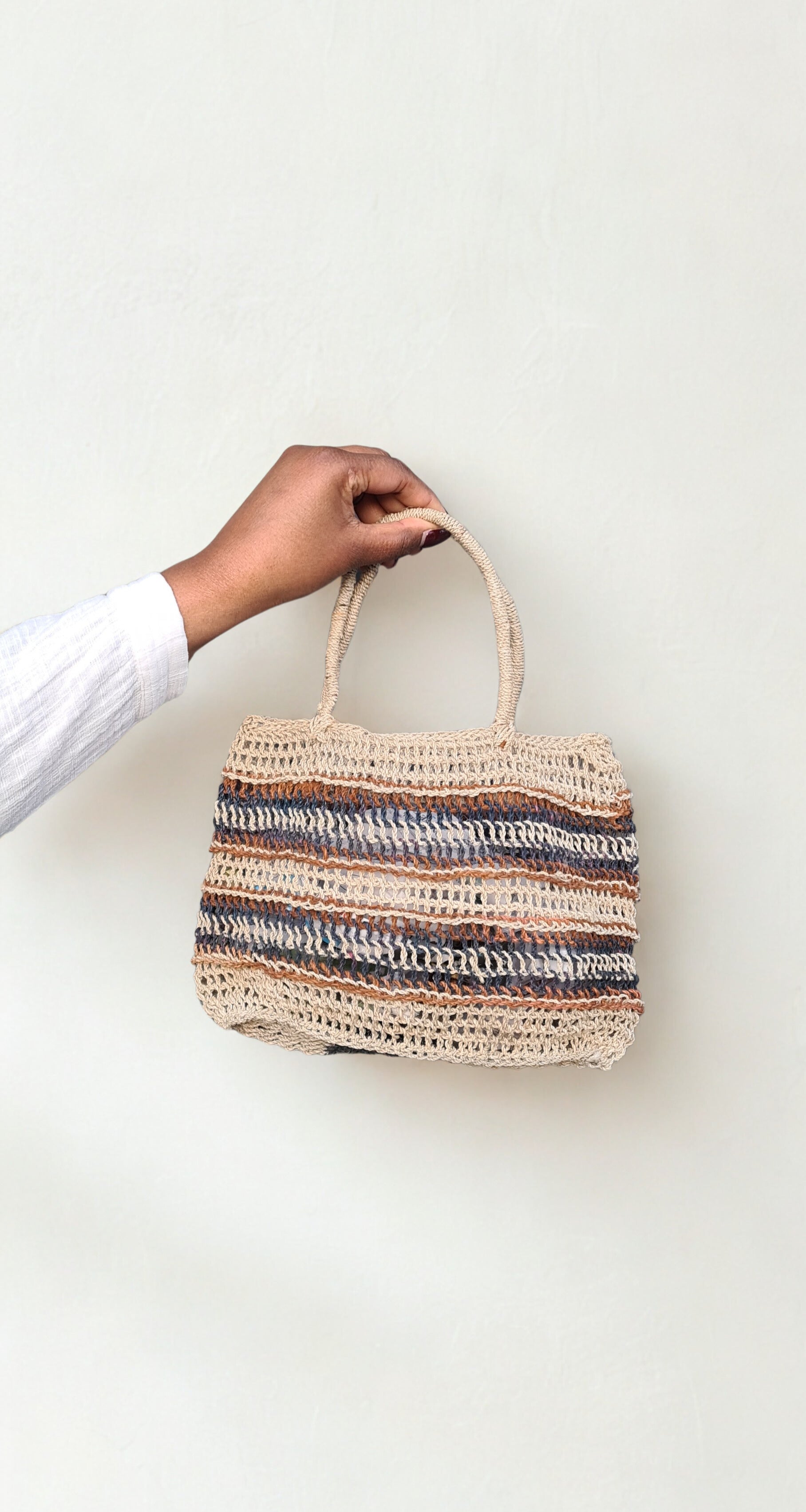 Each bilum is one-of-a-kind and handcrafted using natural materials. To keep it looking its best, avoid prolonged exposure to direct sunlight and moisture, which may cause fading or wear.
