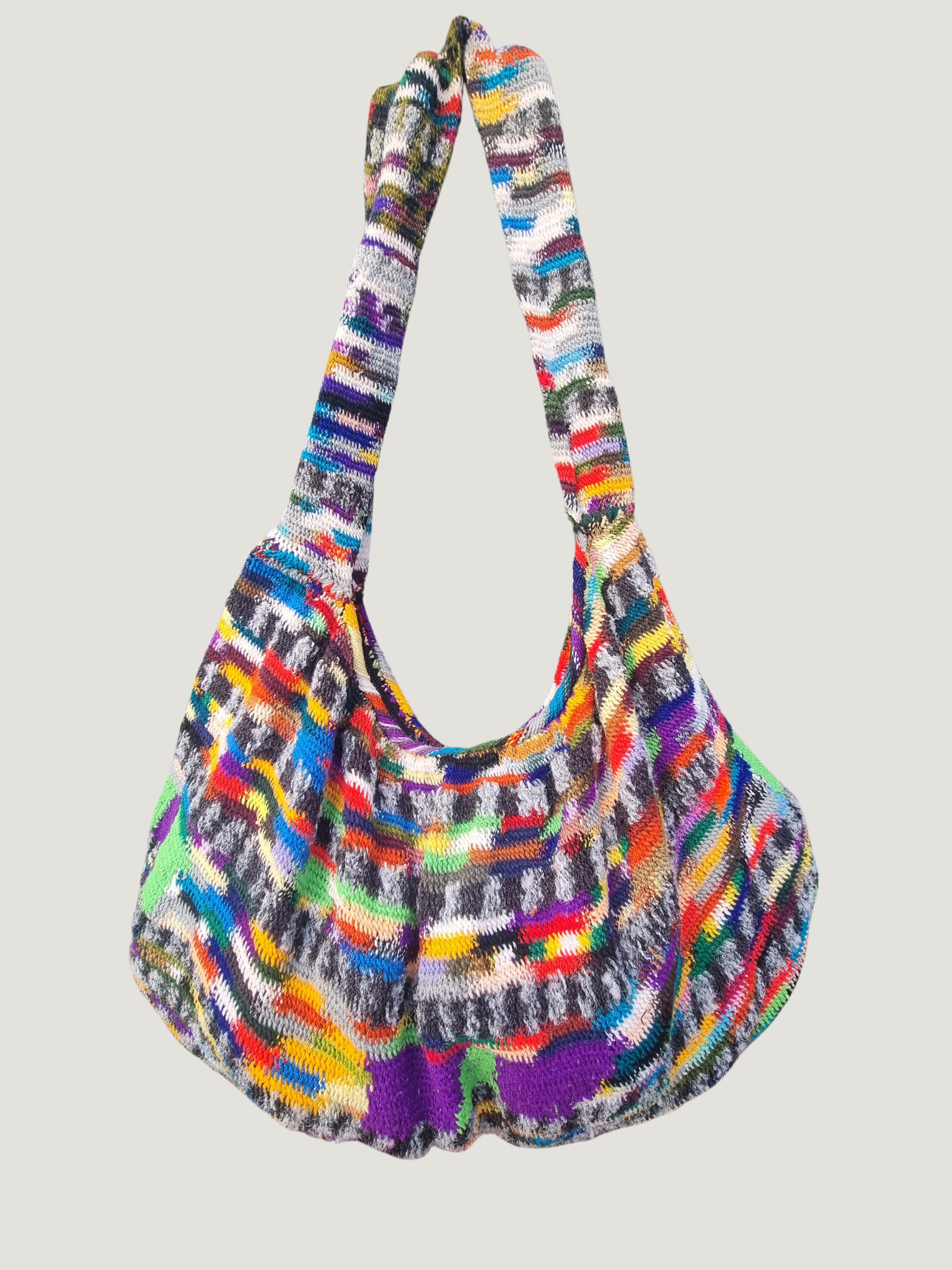 Keep your bilum vibrant by spot cleaning with mild soap and water, or gently hand washing in lukewarm water. If machine washing, use a mesh bag on a cold, delicate cycle, separate from rough fabrics. After washing, reshape and lay flat to dry. Never wring, twist, or hang. Store in a cool, dry place away from direct sunlight and sharp objects to protect its colour and weave.