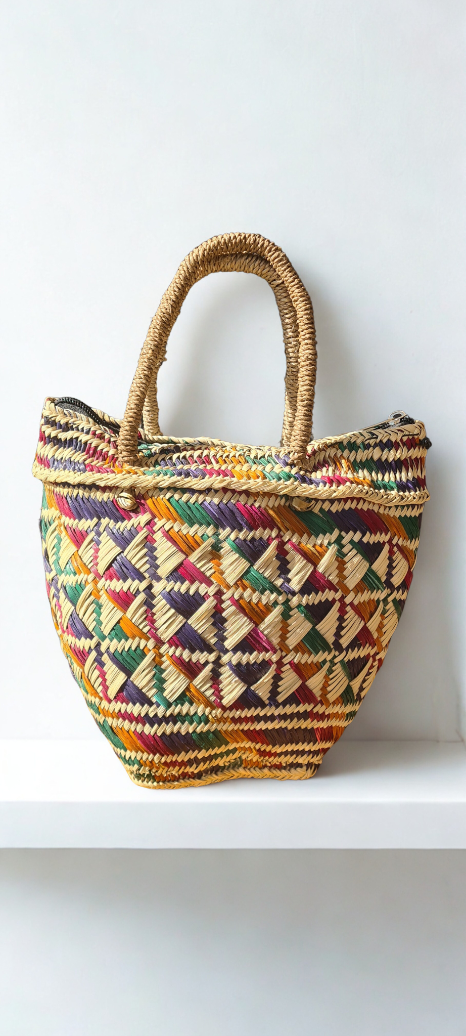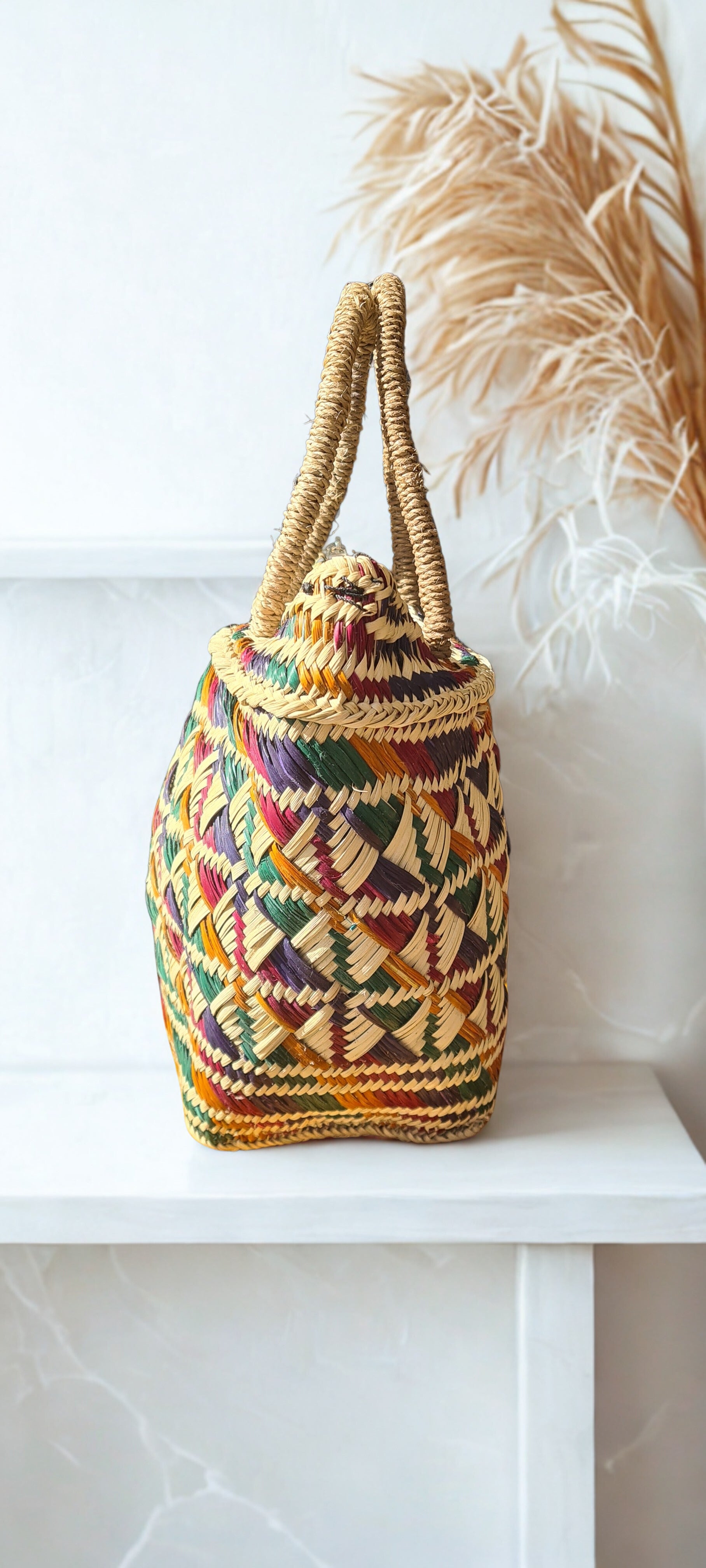 Made from pandanus or swamp grass harvested along the Sepik River, the fibres are carefully dried, hand-dyed in earthy tones, and intricately woven into bold, striking patterns. The natural golden base is beautifully contrasted with vibrant shades of red, teal, mustard, and indigo.